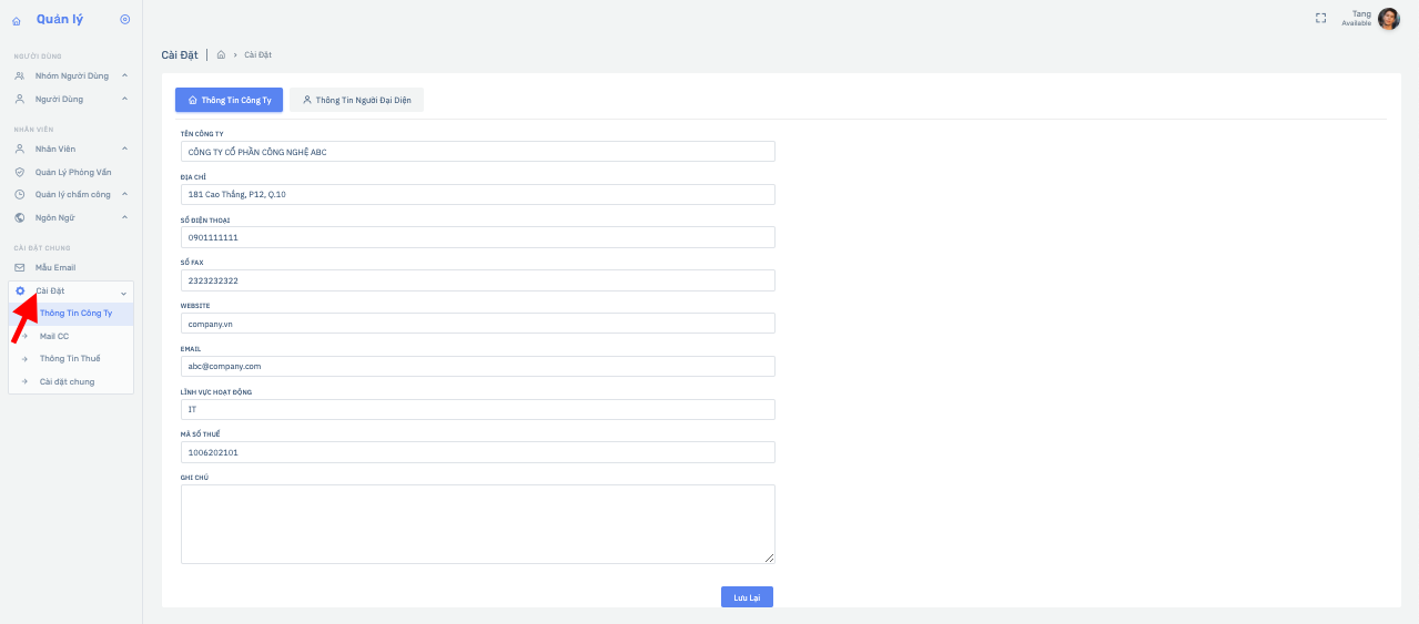 Bấm chuột Thông tin Công ty bên Menu trái để khai báo những thông tin của doanh nghiệp:
