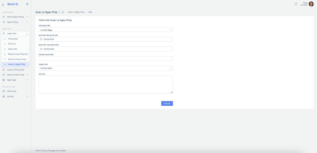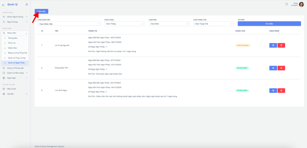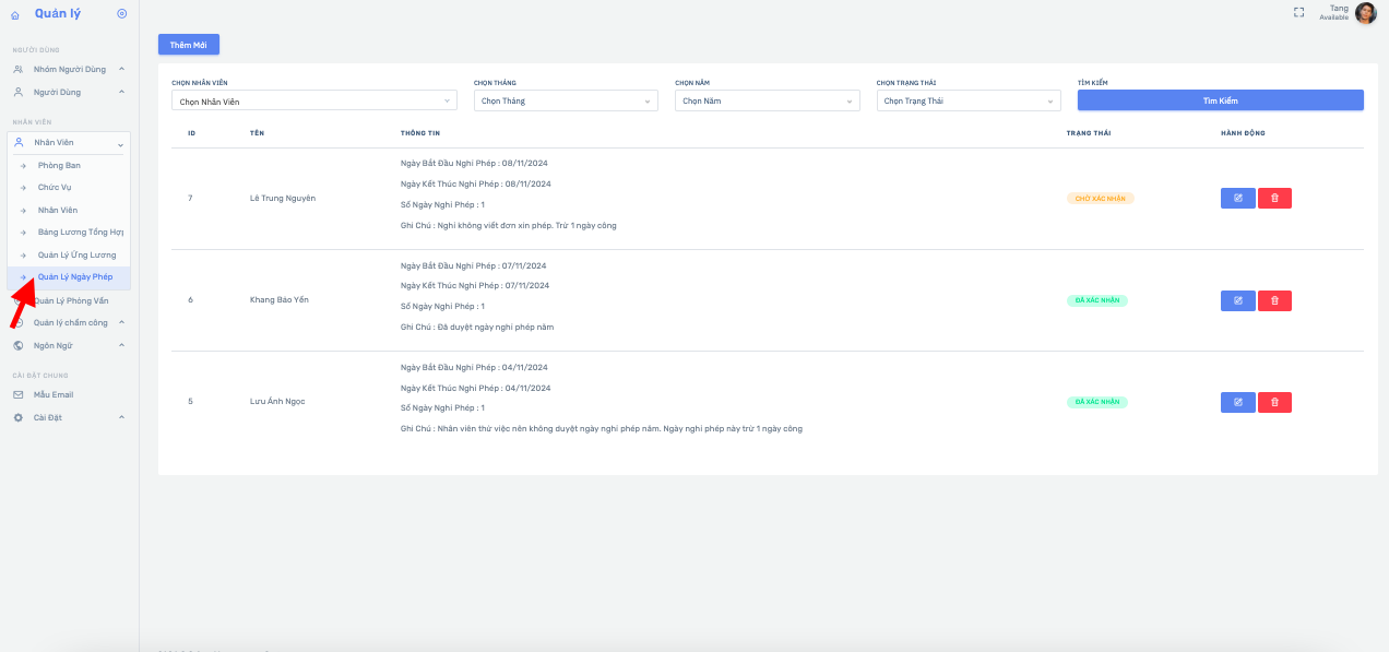 Chọn Quản lý ngày phép ở Menu trái màn hình